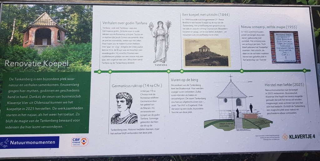 Vanaf de eerste helft van de 19e eeuw werd gedacht dat aan het begin van de jaartelling hier een tempel stond van de godin Tanfana. Zij zou een Germaanse vruchtbaarheidsgodin zijn geweest. Die tempel zou dezelfde zijn als de tempel die in 14 n. Chr. door de Romeinse veldheer Germanicus werd verwoest. Op de achterwand van de koepel is een desbetreffend citaat van de Romeinse geschiedschrijver Tacitus te vinden. Dat de door Tacitus bedoelde tempel op de Tankenberg heeft gestaan, wordt inmiddels door historici onmogelijk geacht met het oog op de eveneens beschreven troepenbewegingen. J. van der Worp concludeerde dat op deze plek of in de directe omgeving van Oldenzaal nooit een tempel kan hebben gestaan; A.G. de Bruyn sloot echter niet uit dat de godin Tanfana in Twente werd aanbeden en dat de Tankenberg daarin mogelijk een rol had gespeeld als religieuze plaats.